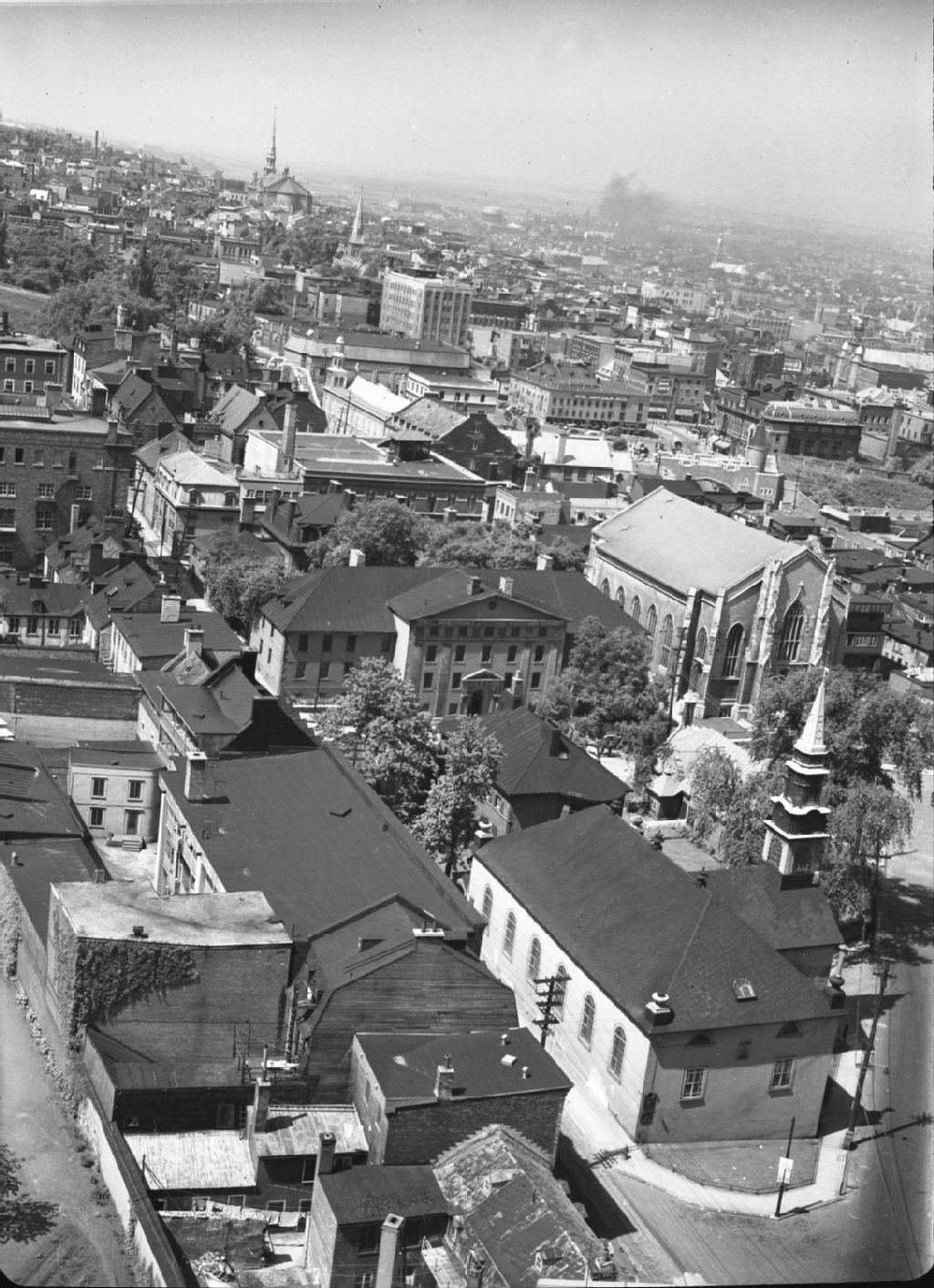 Québec vue de l’Édifice Price : église presbytérienne St-Andrew, Morrin Center, Institut canadien et église St-Jean-Baptiste au loin