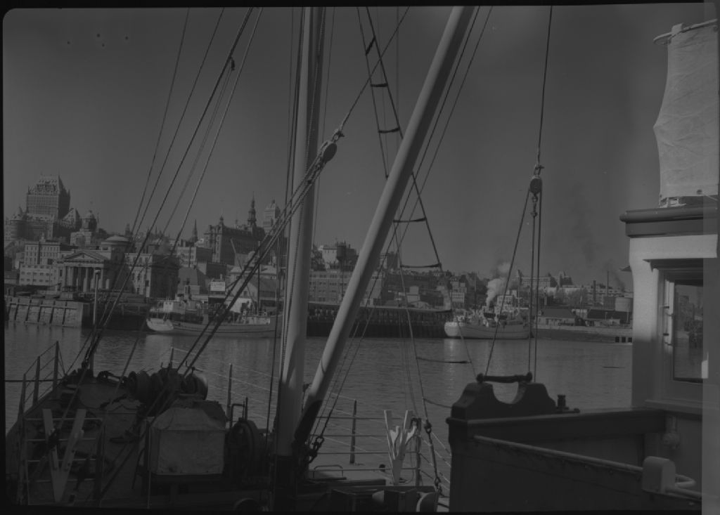 Ville de Québec vue à travers les cordages d'un bateau, Vers 1950, Archives nationales à Québec, Fonds George A. Driscoll, (03Q,P630,S9,D58049), George A. Driscoll.