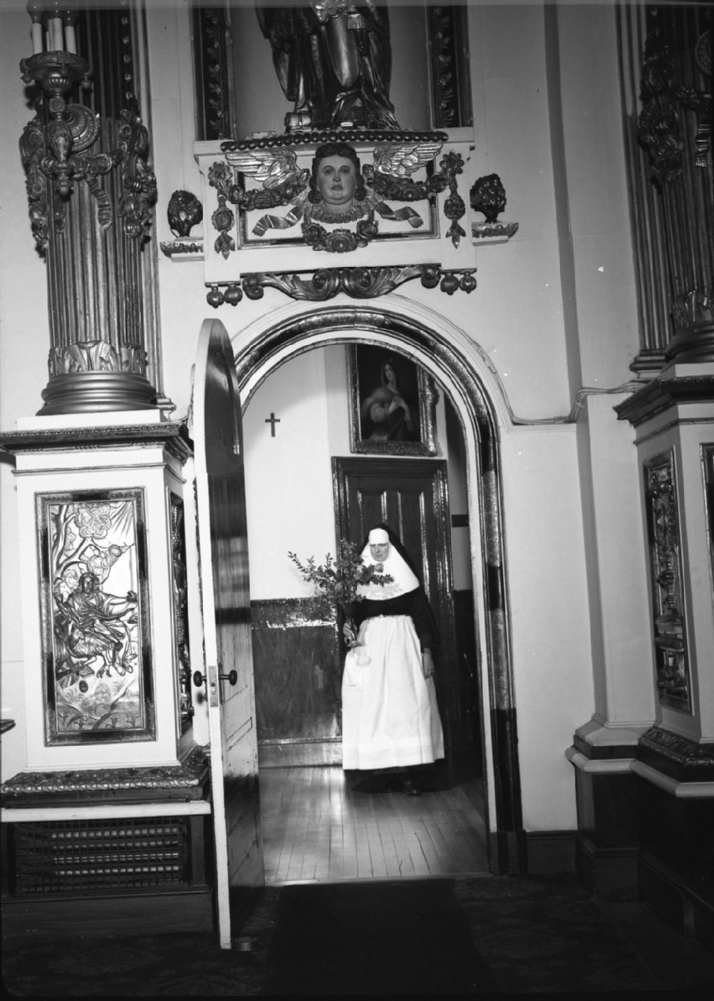 Révérende mère Sainte-Croix portant des fleurs. Couvent des Ursulines, Québec, Vers 1950, Archives nationales à Québec, Fonds George A. Driscoll, (03Q,P630,S12,D58249), George A. Driscoll.