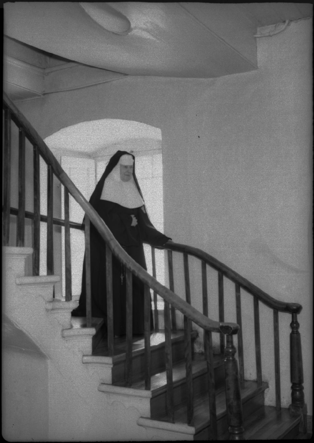 Révérende mère supérieure dans un escalier. Couvent des Ursulines, Québec, Vers 1950, Archives nationales à Québec, Fonds George A. Driscoll, (03Q,P630,S12,D58649), George A. Driscoll.