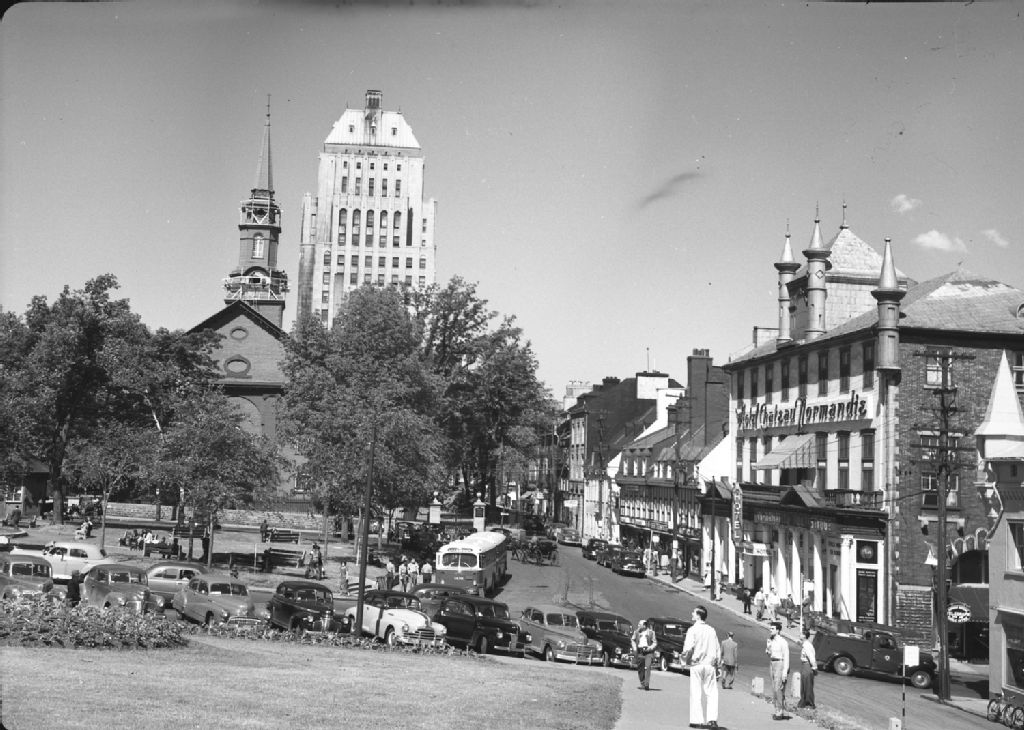 Vieux-Québec : Place d'Armes, cathédrale Holy Trinity, édifice Price, rue Sainte-Anne, hôtel Château Normandie, Vers 1950, Archives nationales à Québec, Fonds George A. Driscoll, (03Q,P630,S17,D56749), George A. Driscoll.