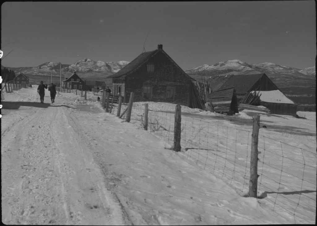 Saint-Hilarion : deux promeneurs sur un chemin, clôture, maisons, montagnes enneigées en arrière-plan