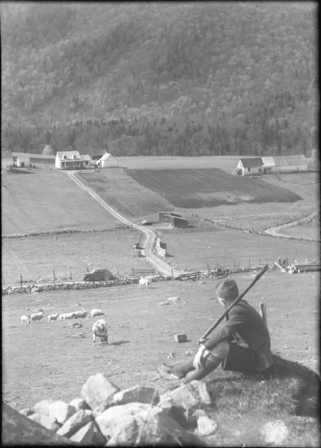 Tewkesbury : un garçon assis sur une butte regarde les champs, animaux, route, maison et bâtiments en arrière-plan, Vers 1950, Archives nationales à Québec, Fonds George A. Driscoll, (03Q,P630,S16,D21149), George A. Driscoll.