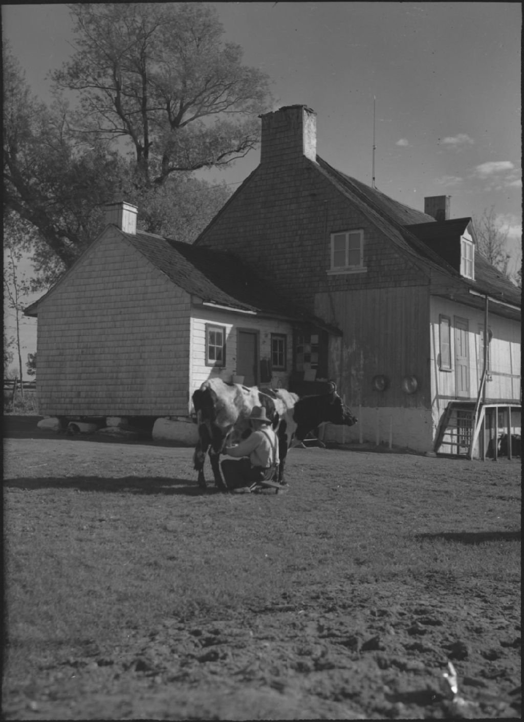 Île d'Orléans : traite d'une vache près d'une maison, Vers 1950, Archives nationales à Québec, Fonds George A. Driscoll, (03Q,P630,S16,D21851), George A. Driscoll.