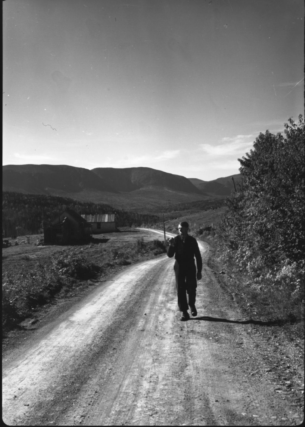 Mont-Louis : un homme marche sur la route. Bâtiments et montagnes en arrière-plan