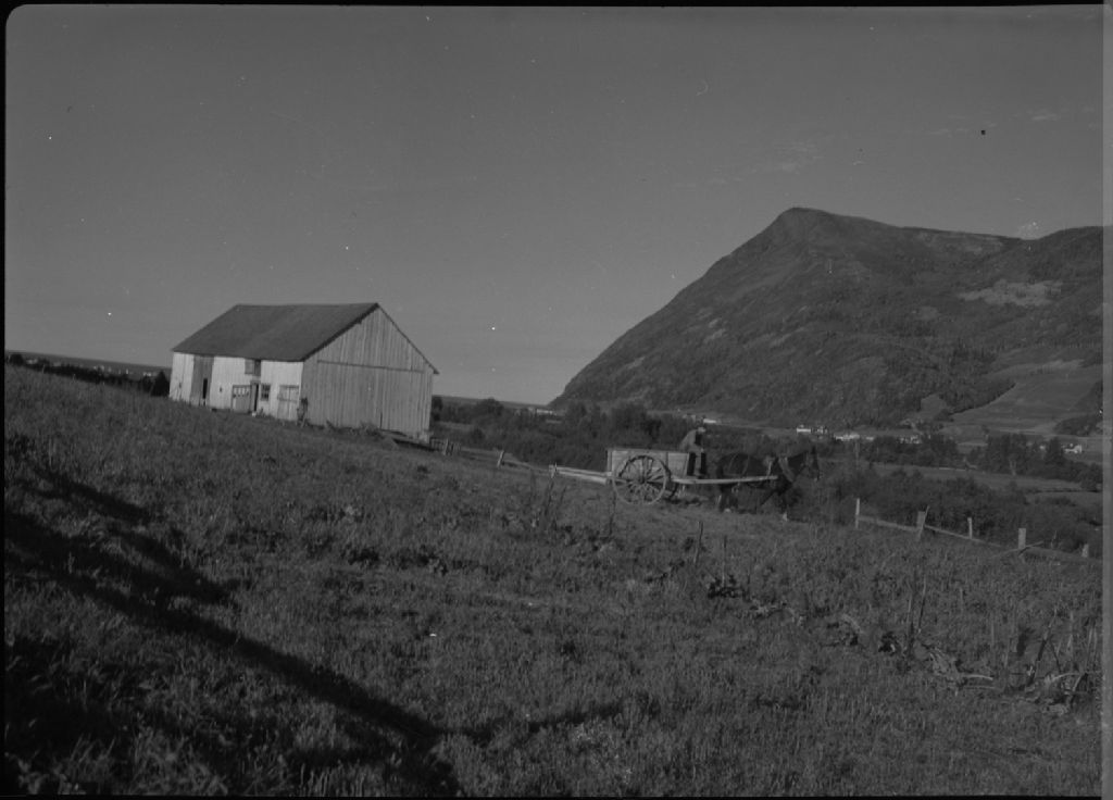 L'Anse-à-Beaufils : charrette dans un champ, grange, montagne en arrière-plan, Vers 1950, Archives nationales à Québec, Fonds George A. Driscoll, (03Q,P630,S16,D63651), George A. Driscoll.