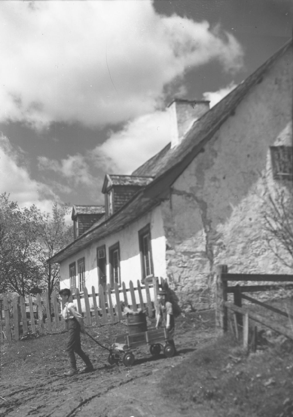 Des enfants jouent avec une petite voiture près d'une maison, Vers 1950, Archives nationales à Québec, Fonds George A. Driscoll, (03Q,P630,S16,D66749), George A. Driscoll.