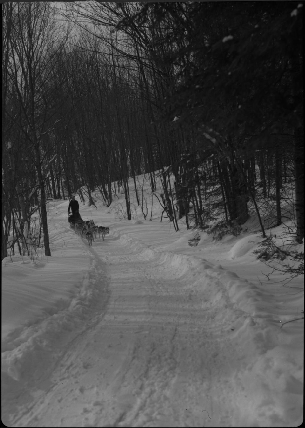Traîneau tiré par des chiens dans un sentier forestier. Gray Rocks, Mont Tremblant, vers 1950, Archives nationales à Québec, Fonds George A. Driscoll, (03Q,P630,S14,D80651), George A. Driscoll.