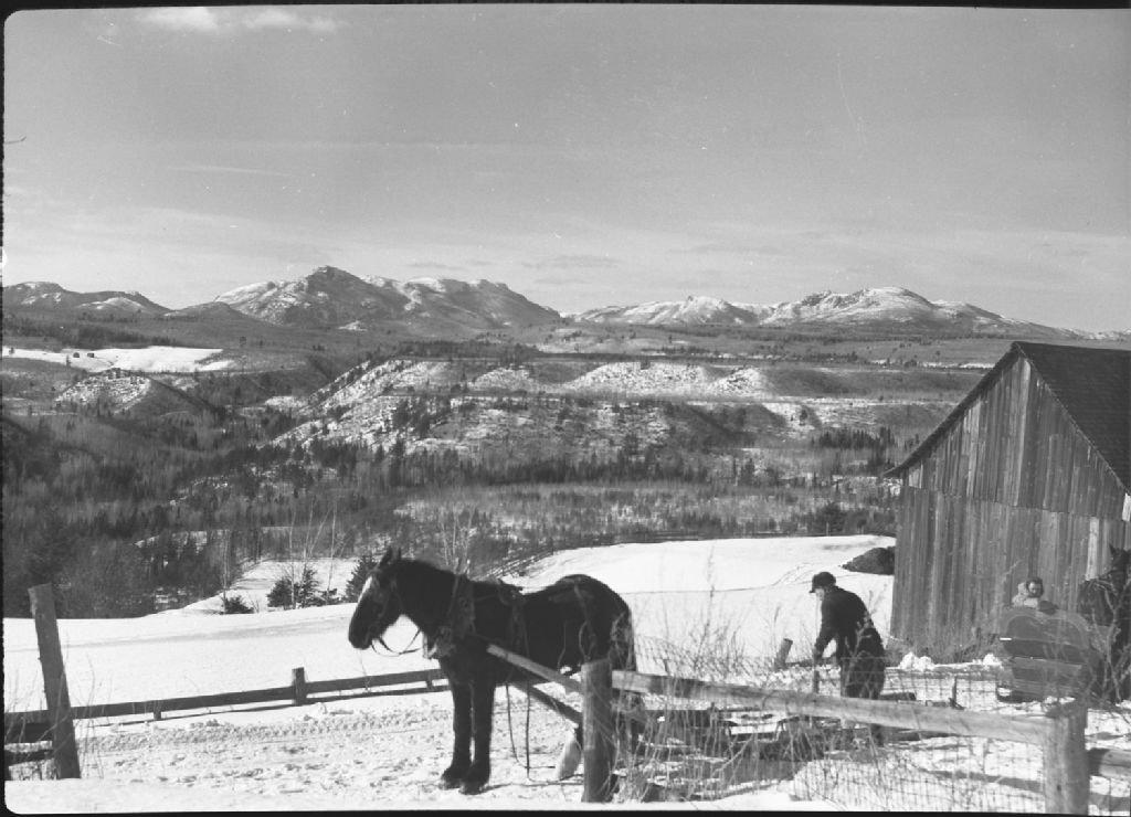 Saint-Urbain : transport de bois avec un cheval, Vers 1950, Archives nationales à Québec, Fonds George A. Driscoll, (03Q,P630,S16,D5549), George A. Driscoll.