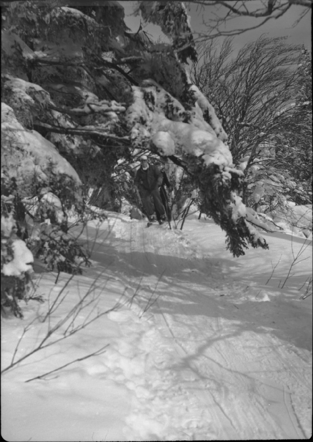 Skieur dans un sentier bordé d'arbres enneigés. Mont Tremblant, vers 1950, Archives nationales à Québec, Fonds George A. Driscoll, (03Q,P630,S14,D86151), George A. Driscoll.