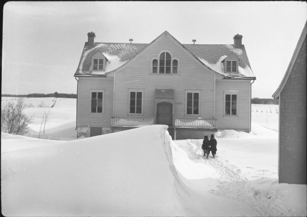 Saint-Pierre, Île d'Orléans : deux enfants marchent vers leur école en hiver