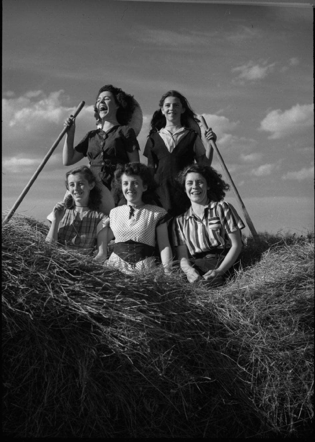 Saint-Narcisse : cinq jeunes filles dans une charrette de foin, Vers 1950, Archives nationales à Québec, Fonds George A. Driscoll, (03Q,P630,S16,D39351), George A. Driscoll.