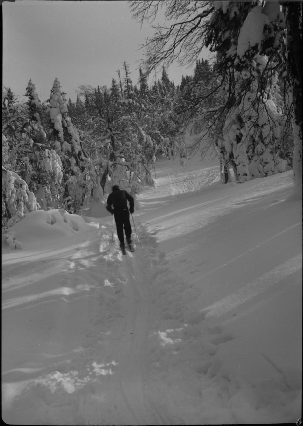 Skieur dans un sentier bordé d'arbres enneigés. Mont Tremblant, vers 1950, Archives nationales à Québec, Fonds George A. Driscoll, (03Q,P630,S14,D86351), George A. Driscoll.