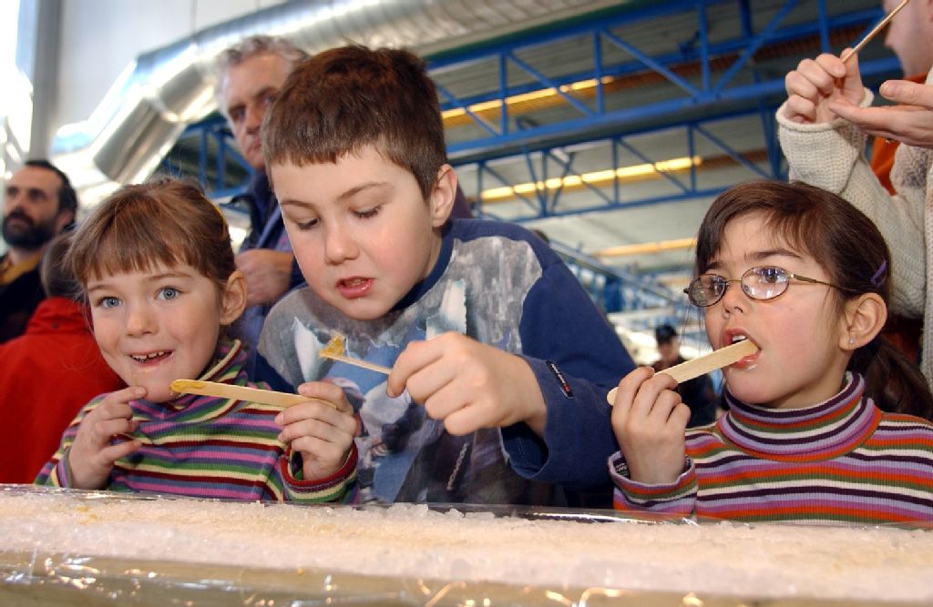 Des enfants mangent de la tire d'érable, 2002-04-08, Archives nationales à Québec, Fonds Steve Deschênes, (03Q,P863,S2,D273), Photographe non identifié.