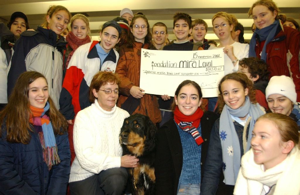 Des gens soulèvent un chèque de la Fondation Mira, 2002-10-30, Archives nationales à Québec, Fonds Steve Deschênes, (03Q,P863,S2,D467), Photographe non identifié.