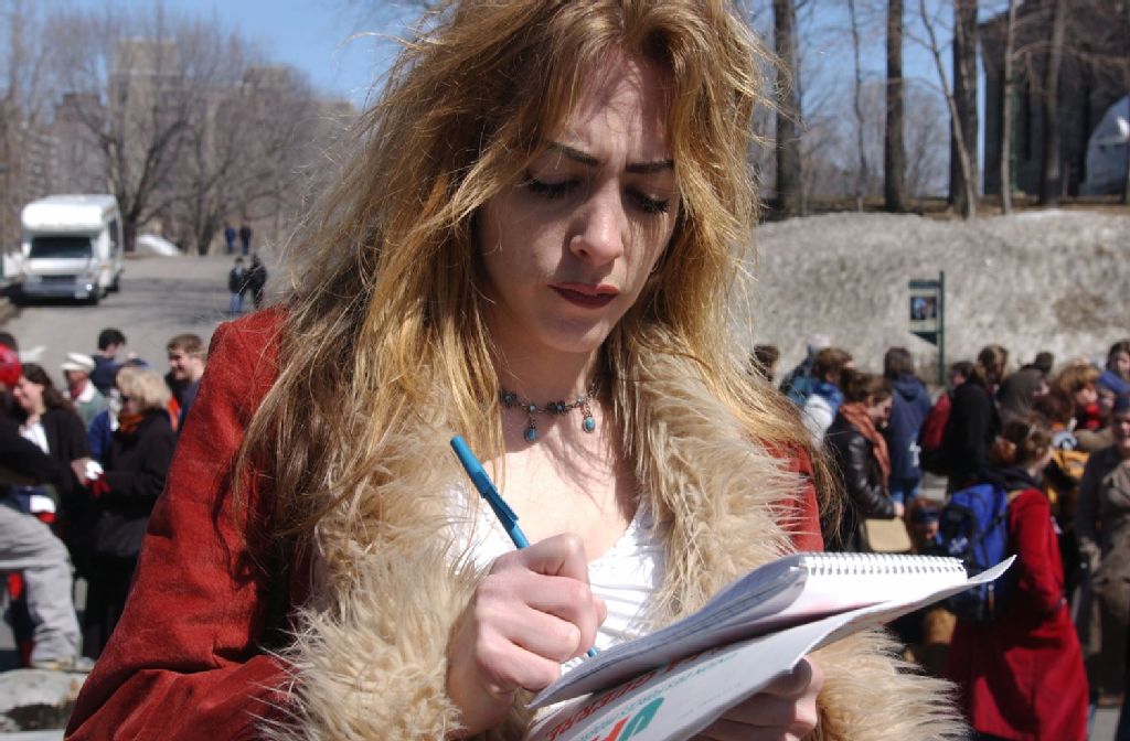 La journaliste Élisabeth Fleury, 2003, Archives nationales à Québec, Fonds Steve Deschênes, (03Q,P863,S2,D1839), Photographe non identifié.