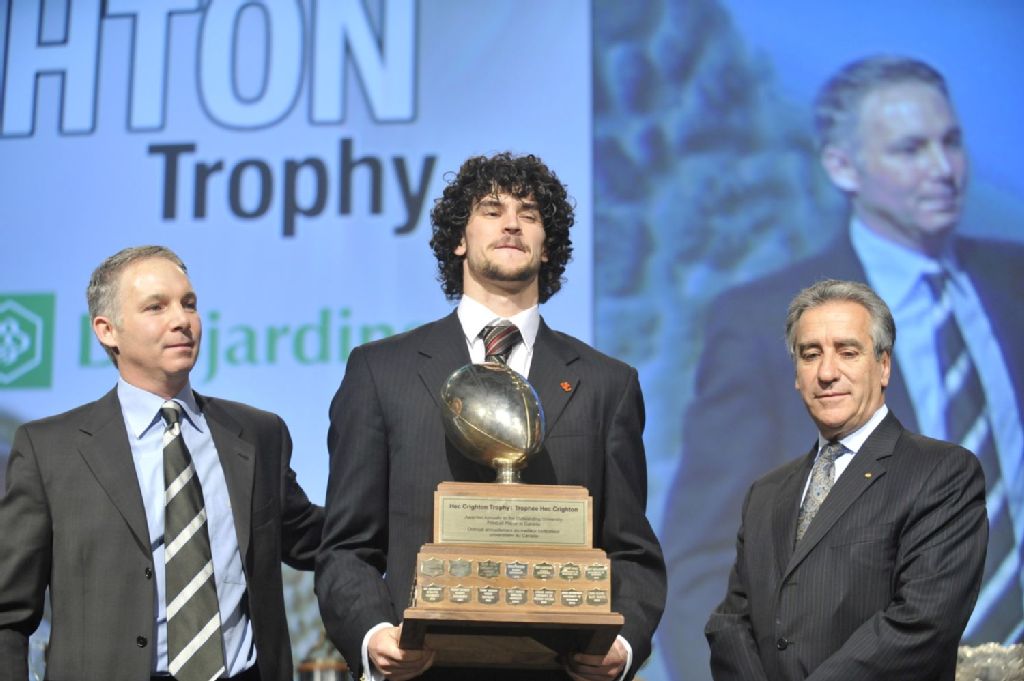 Le trophée Hec Crighton est remis à Erik Glavic des Dinos de Calgary; 5 joueurs du Rouge et Or de l'Université Laval montre leur bague de championnat, 2009, Archives nationales à Québec, Fonds Steve Deschênes, (03Q,P863,S2,D6879), Photographe non identifié.