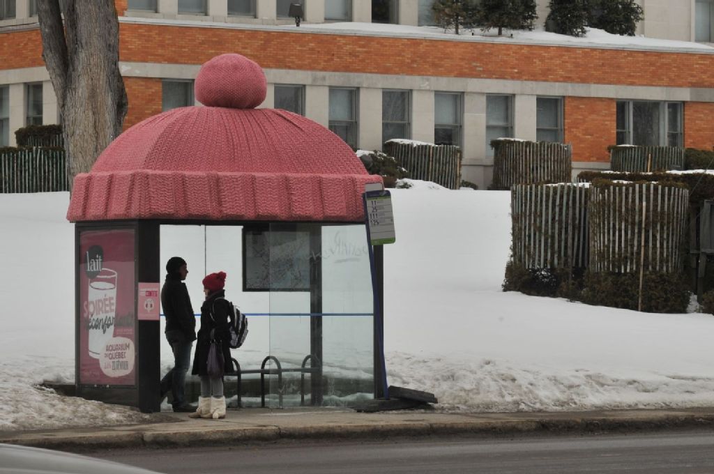 Un abris-bus avec une tuque sur le dessus (publicité Le lait)