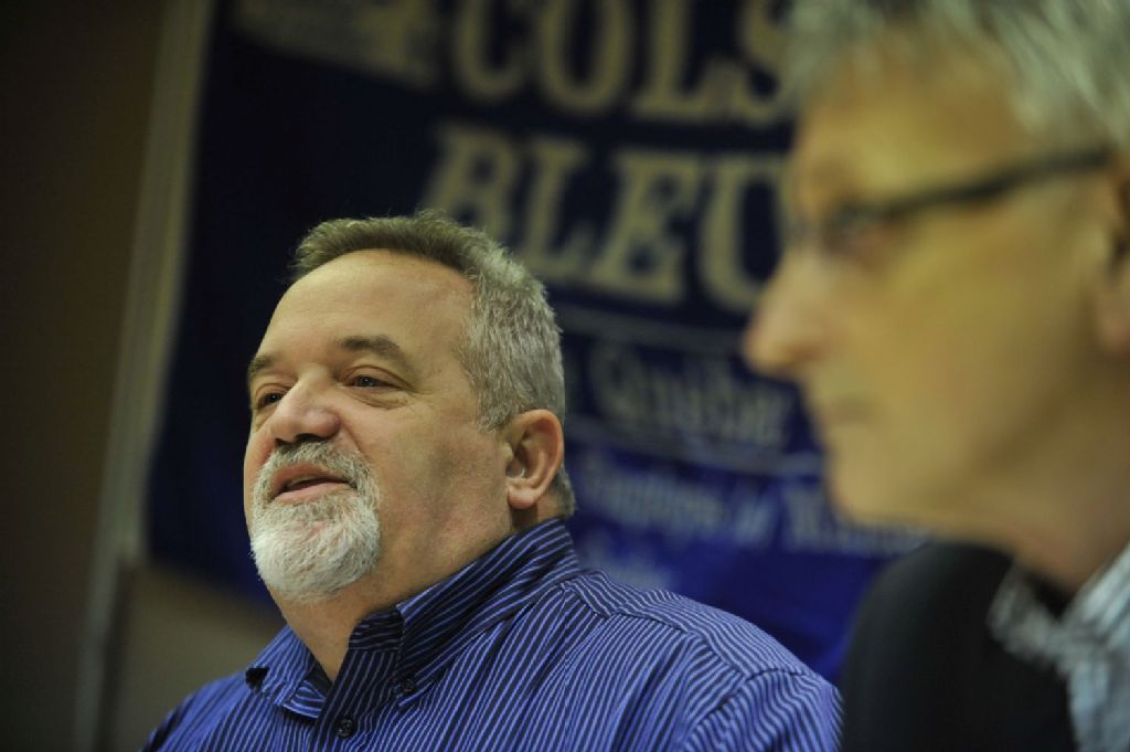 Conférence de presse du Syndicat canadien de la fonction publique (cols bleus), 2012, Archives nationales à Québec, Fonds Steve Deschênes, (03Q,P863,S2,D8515), Photographe non identifié.
