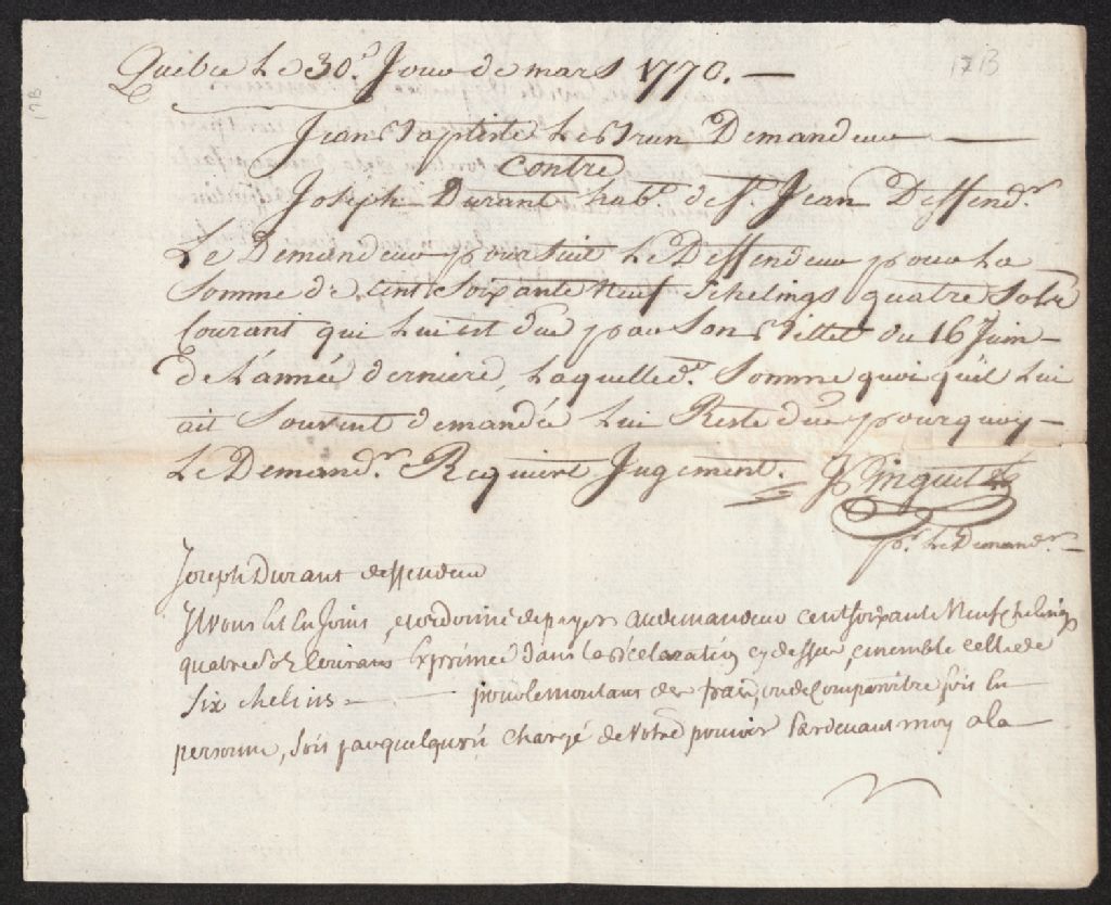 Procès entre Jean-Baptiste Lebrun, d'une part, et Joseph Durand, habitant de Saint-Jean, d'autre part, à propos du paiement d'une somme de 169 shillings et 4 sols en monnaie courante de la province de Québec, laquelle somme est due par ledit Durand suivant son billet en date du 16 juin 1769