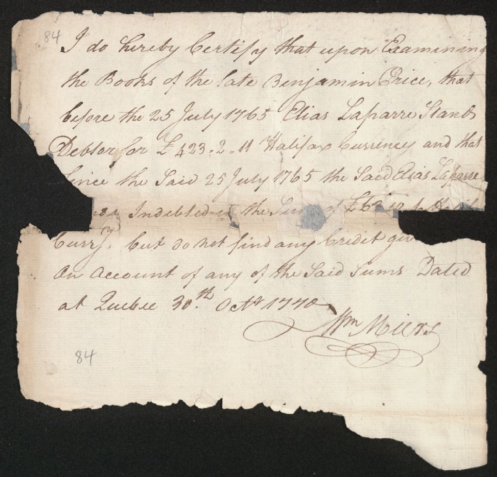 - Ce dossier en matières civiles provient de la Cour des plaidoyers communs. Il comprend un certificat de William Miers, suivant son examen de la comptabilité de feu Benjamin Price, confirmant les sommes dues par Elias [Élie] Laparre et l'absence de crédit de pareilles sommes ; un compte courant entre les créanciers d'Élie Laparre et Monsieur Lévesque ; un mandat d'assignation (warrant) à Marie-Angélique Chapeau ; une citation à comparaître à la veuve de Pierre Doré, demeurant à Jacque-Cartier, à titre de témoin dans le procès entre Alexandre Dumas, au nom et comme syndic des créanciers d'Élias [Élie] Laparre, et Marie-Angélique Chapeau, femme de Louis Bouchaud (Boucheau)