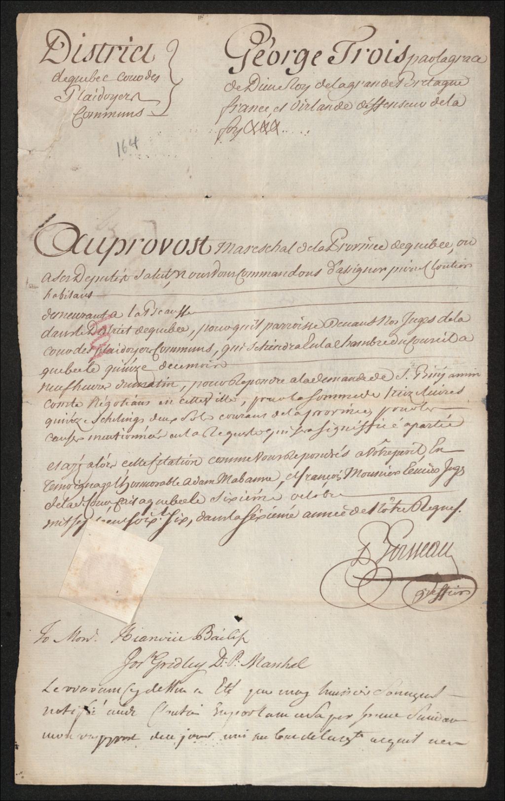 Procès entre Benjamin Comte (Lecomte), négociant en la ville de Québec, d'une part, et Pierre Cloutier, marchand et habitant, demeurant en Beauce, d'autre part, à propos du paiement d'une somme de 11 livres et 3 shillings en monnaie courante de la province de Québec due par ledit Cloutier, 4 juillet 1766 - 9 octobre 1766, Archives nationales à Québec, Fonds Cour des plaidoyers communs, (03Q,TP5,S1,SS1,D164).