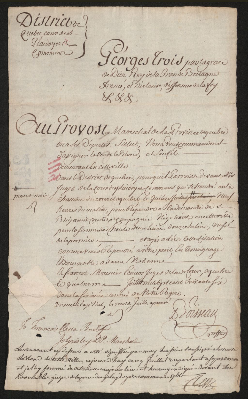 Procès entre Benjamin Comte (Lecomte) et compagnie, négociant en la ville de Québec, d'une part, et Dame veuve Leblond et son fils, demeurant en la ville de Québec, d'autre part, à propos du paiement d'une somme de 32 livres, 12 shillings et 1 sol de la province de Québec, 4 juillet 1766, Archives nationales à Québec, Fonds Cour des plaidoyers communs, (03Q,TP5,S1,SS1,D243).