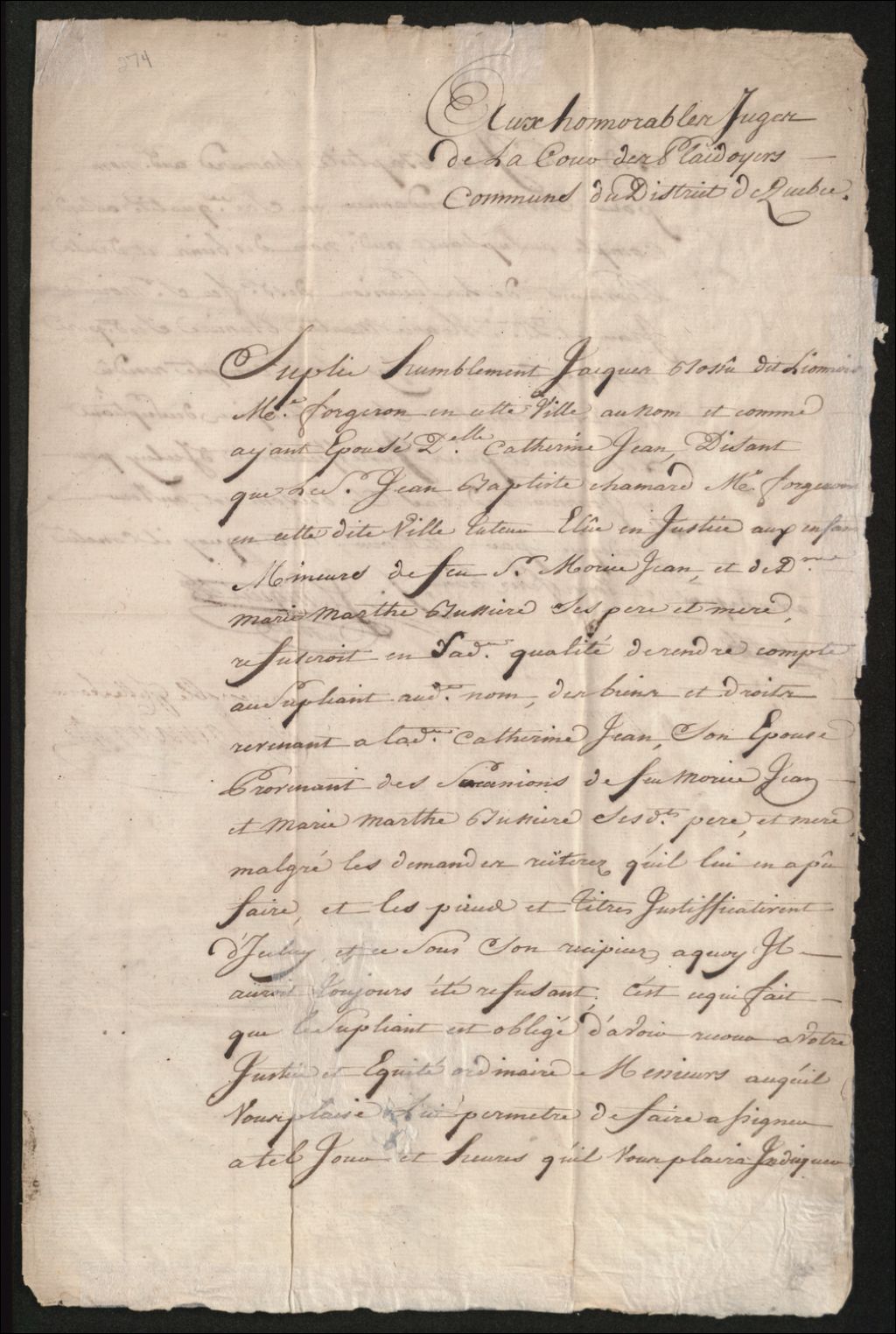 Procès entre Jacques Bossu dit Lionnois (Lyonnais), maître forgeron en la ville de Québec, au nom et comme ayant épousé Catherine Jean, d'une part, et Jean-Baptiste Chamard, maître forgeron en la ville de Québec, tuteur élu en justice aux enfants mineurs de feu Maurice Jean et de Marie-Marthe Bussière, d'autre part, à propos de la gestion des biens et droits provenant de la succession desdits feu Maurice Jean et Marie-Marthe Bussière, 16 juillet 1768, Archives nationales à Québec, Fonds Cour des plaidoyers communs, (03Q,TP5,S1,SS1,D274).