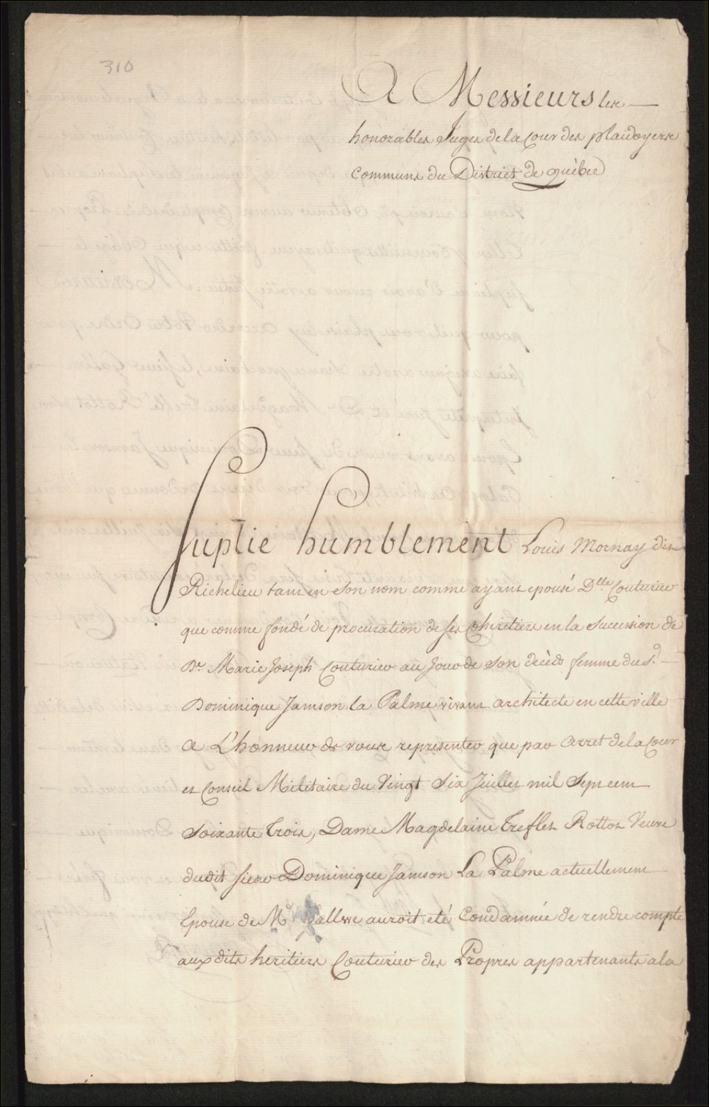 - Ce dossier en matières civiles provient de la Cour des plaidoyers communs. Il comprend un mandat d'assignation au sieur Gallwey, interprète juré, et à son épouse, dame Madeleine Trefflé Rotot, veuve du sieur Dominique Janson Lapalme, architecte, demeurant à Québec, afin qu'ils comparaissent devant les juges de la Cour des plaidoyers communs et réponde à la demande de Louis Mornay dit Richelieu, époux de demoiselle Couturier; sa signification par le huissier; un bref de Certiorari; une requête rédigée par maître Jean-Baptiste Lebrun, avocat de Gallwey, pour faire examiner la cause par un corps de jurés composé à moitié d'anciens sujets britanniques et à moitié de nouveaux