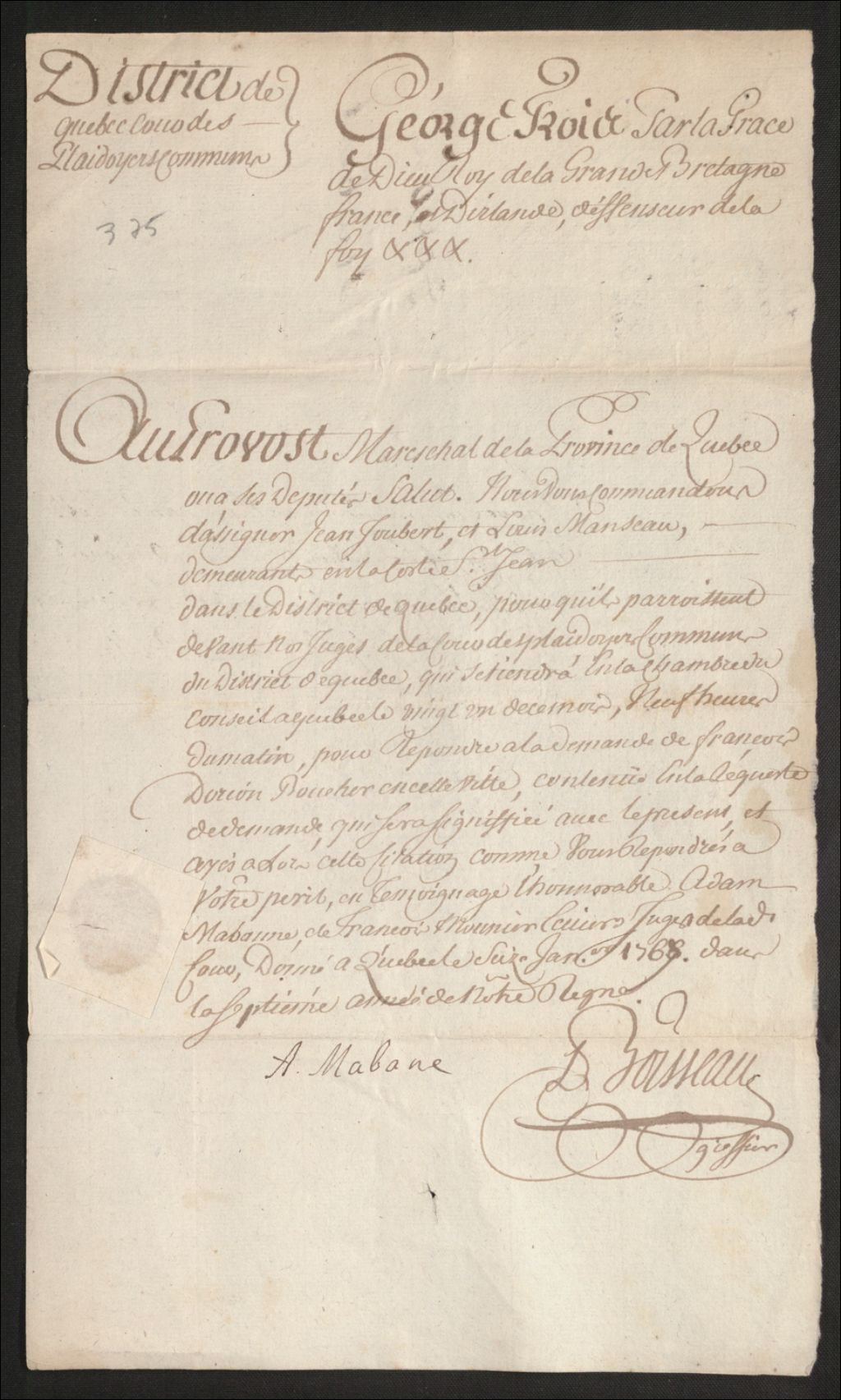 - Assignation à Jean Joubert et Louis Manseau, demeurant à la Côte de Saint-Jean, afin qu'ils comparaissent devant les juges de la Cour des plaidoyers communs du District de Québec et répondent à la demande de François Dorion, boucher en cette ville