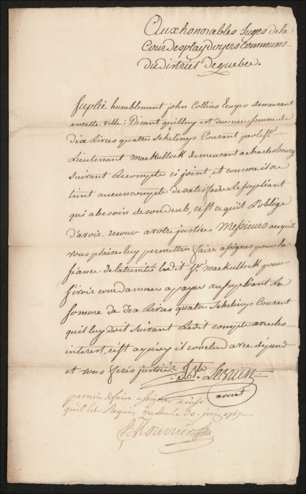 - Procès entre John Collins, écuyer de Québec, d'une part, et lieutenant Kenneth Mackullock (McCulloch, MacCulloch, McCullough), habitant de Charlesbourg, d'autre part, à propos d'une dette impayée