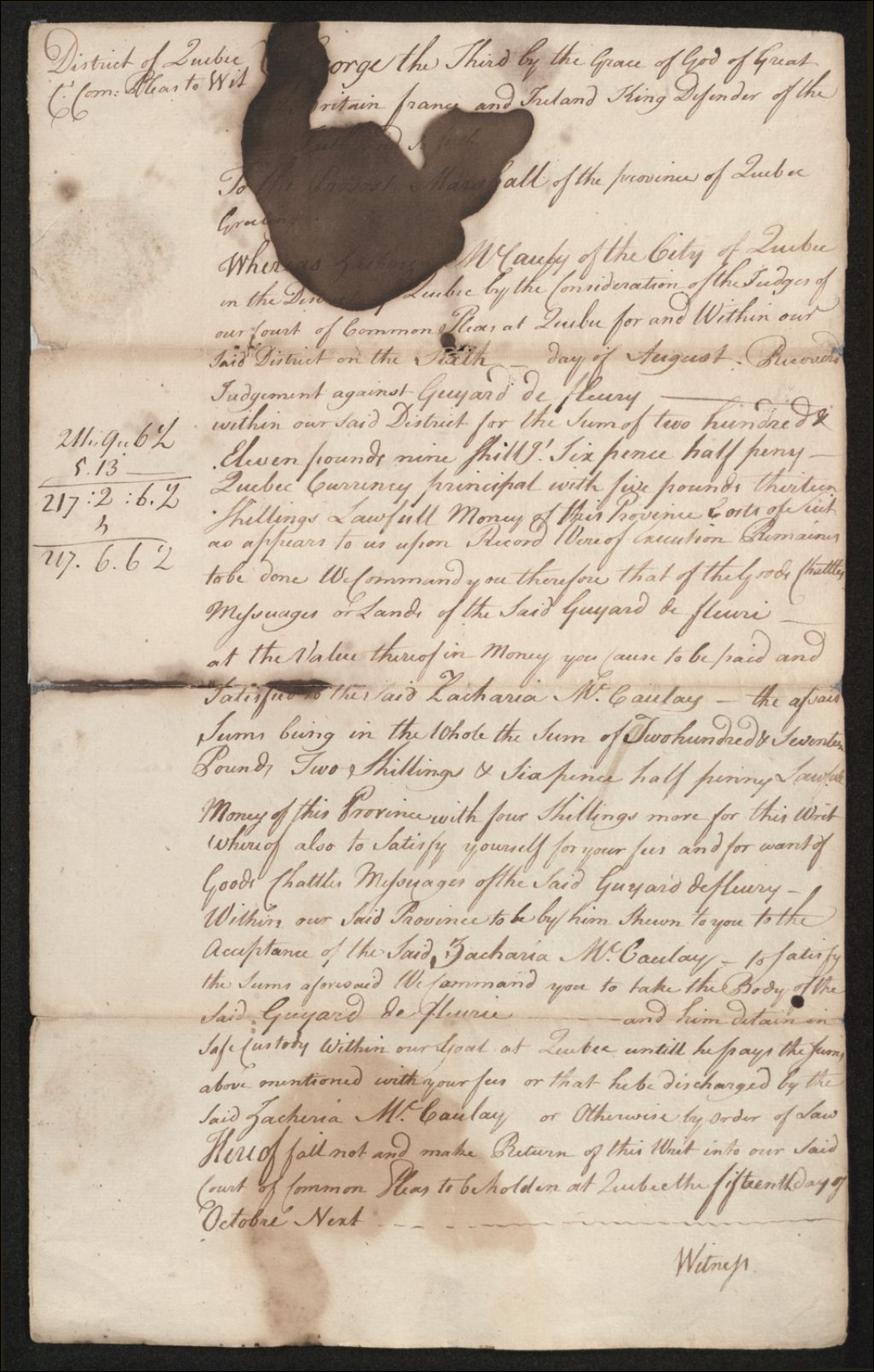 Procès entre Zachary Macaulay (Maccaulay), d'une part, et Guyard de Fleury, d'autre part, à propos de la saisie d'une terre et d'une maison, 6 février 1767 au 6 février 1768, Archives nationales à Québec, Fonds Cour des plaidoyers communs, (03Q,TP5,S1,SS1,D397).