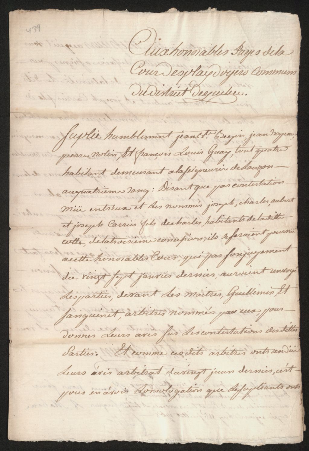 - Ce dossier en matières civiles provient de la Cour des plaidoyers communs. Il comprend deux copies d'une requête de Jean-Baptiste Bégin, Jean Drapeau, Pierre Nolin ainsi que François-Louis Guay, réclamant à Joseph Carrier, Charles Aubert, ainsi que Jean Carrier, fils de Charles, d'être condamnés suivant l'avis arbitral du 20 juin 1768 conernant le bornage de terres; une requête des sieurs Carrier et Aubert pour faire assigner Richard Murray, gérant de la seigneurie de la Pointe de Lévy en défense de leur cause; un témoignage des sieurs Carrier et Aubert pour les arbitres nommés; une réplique des sieurs Bégin, Drapeau, Nolin et Guay à l'intention des arbitres nommés; un témoignage de Richard Murray; deux copies d'un mandat d'assignation des sieurs Carrier et Aubert