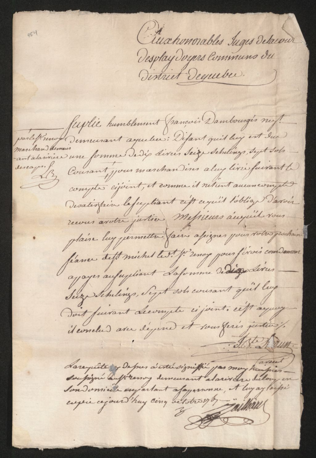 - Ce dossier en matières civiles provient de la Cour des plaidoyers communs. Il comprend une requête de François Dambourges, réclamant à François Renoy (Renouard), une somme de 10 livres, 16 shillings et 7 sols, en argent courant, à propos de marchandises vendues et impayées; une déposition de Richard Murray, écuyer de Québec; trois exploits de saisie contre le sieur Renoy; un mandat d'assignation pour le sieur Renoy