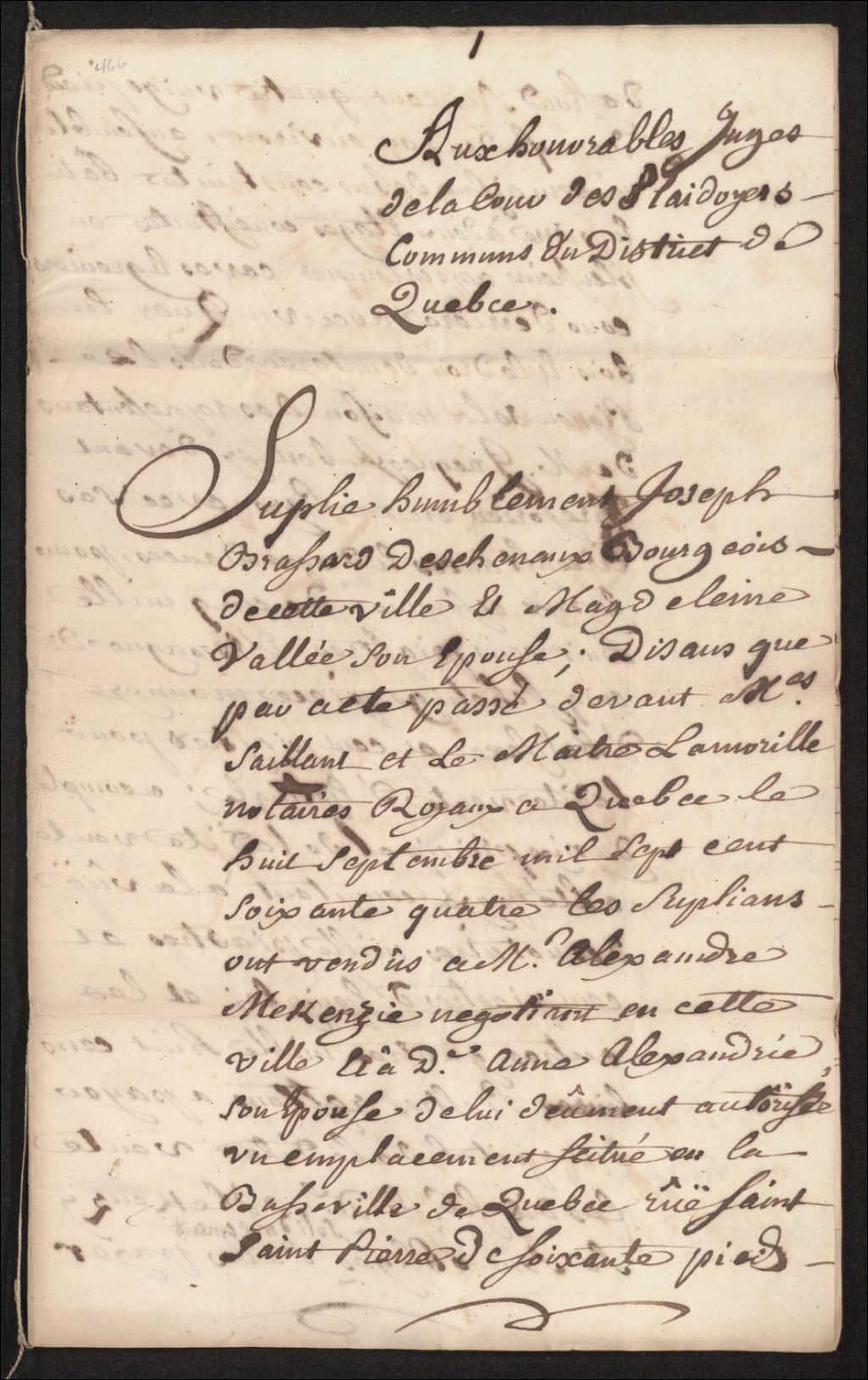 - Ce dossier en matières civiles provient de la Cour des plaidoyers communs. Il comprend une requête de Joseph Brassard Deschenaux ainsi que Madeleine Vallée, réclamant à Alexandre McKenzie (MacKenzie), à être autorisé, faute de paiement suivant la vente antérieure, à vendre un emplacement et une maison situé en basse-ville de Québec, rue Saint-Pierre, mesurant 60 pieds par 180 pieds avec une maison deux étages
