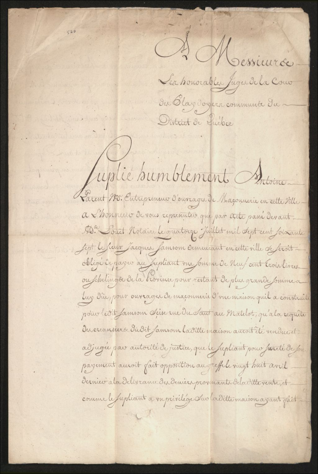 Procès entre Antoine Parent, maître entrepreneur d'ouvrages de maçonnerie de Québec, d'une part, et Jacques Samson, cabaretier de Québec, d'autre part, à propos de la somme de 903 livres ou shillings pour le prix d'ouvrages de maçonnerie, en vertu d'une obligation passée devant maître Louet, notaire, le 14 juillet 1767, que ledit Parent réclame sur les deniers provenant de la vente de la maison dudit Samson sise rue du Sault-au-Matelot à Québec, ayant un privilège sur lesdits deniers pour avoir fait la maçonnerie de la maison en question