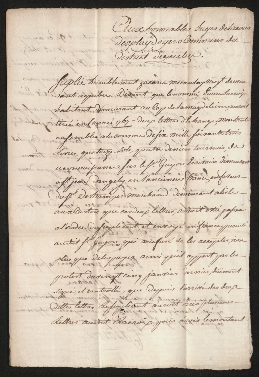 - Ce dossier en matières civiles provient de la Cour des plaidoyers communs. Il comprend une requête de Zachary Macaulay, réclamant la somme de 159 livres, 13 shillings et 2 sols pour le capital de deux lettres d'échange et dommages, un exploit de signification de requête à Pierre Lacroix, un mandat d'assignation (warrant) audit Lacroix et un exploit d'assignation en conséquence