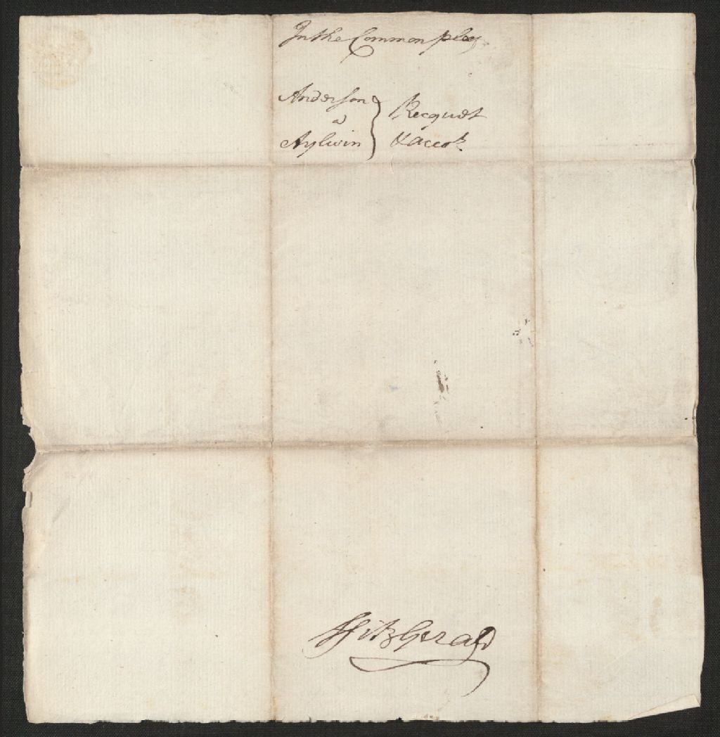 - Ce dossier en matières civiles provient de la Cour des plaidoyers communs. Il comprend une requête de Duncan Anderson, réclamant la somme de 19 livres, 13 shillings et 7 pence, un compte produit par ledit Anderson à Thomas Aylwin et un procès-verbal d'arbitrage dressé par John Danser et Archibald Douglas déclarant qu'il n'y avait pas d'entente entre les parties en cause