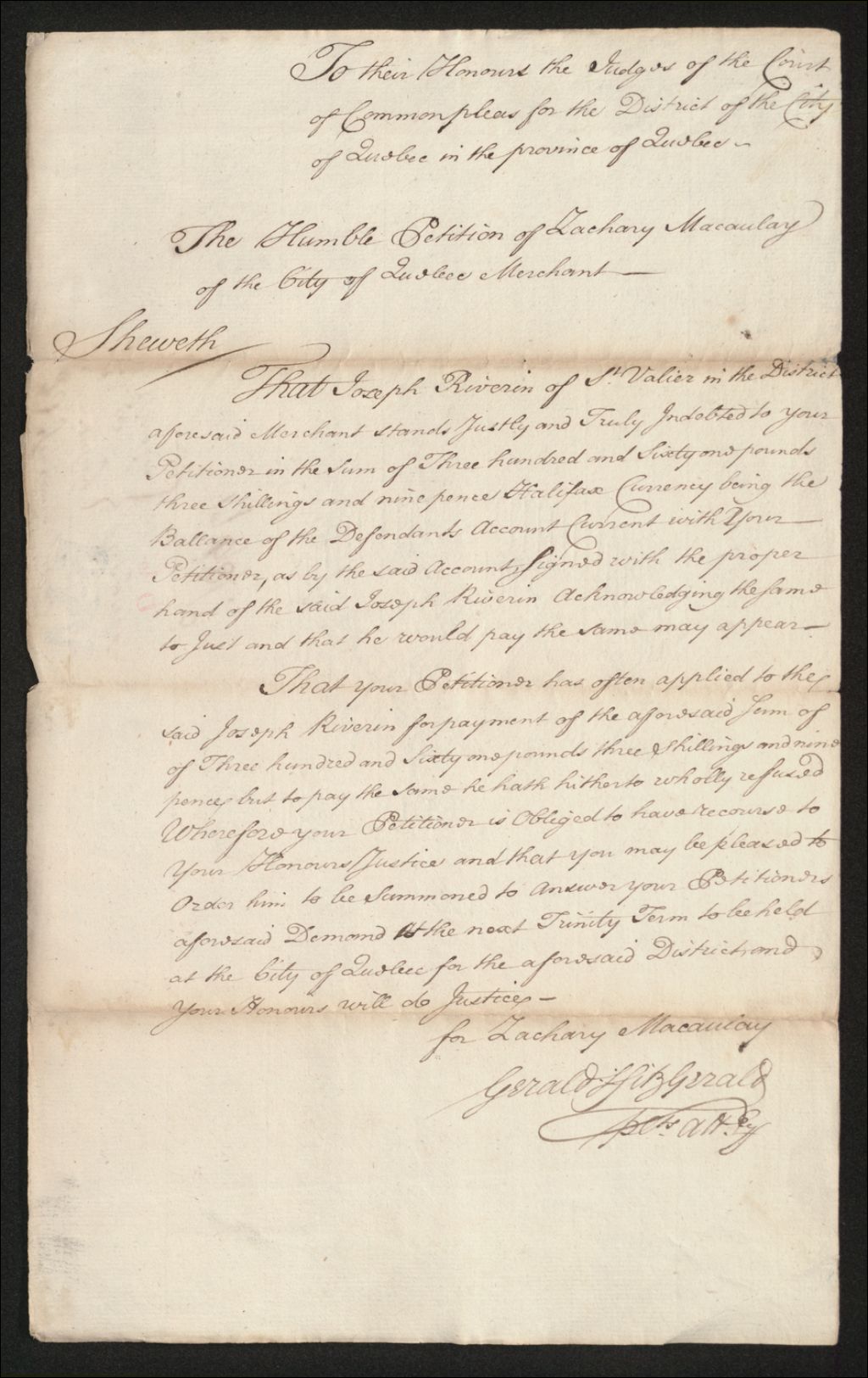 Procès entre Zachary Macaulay, marchand de Québec, d'une part, et Joseph Riverin, marchand de Saint-Vallier, d'autre part, à propos de la somme de 361 livres, 3 shillings et 9 pence en argent d'Halifax pour la balance d'un compte