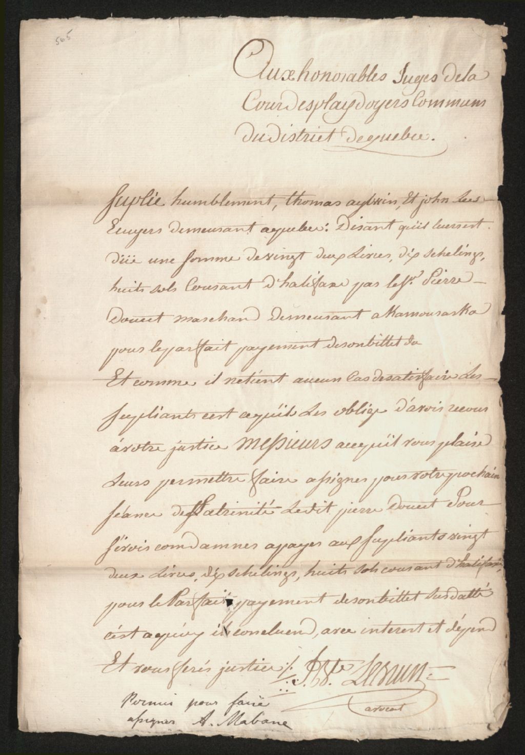 Procès entre Thomas Aylwin et John Lees (Lee), écuyers, demeurant à Québec, d'une part, et Pierre Doucet, marchand demeurant à Kamouraska, d'autre part, à propos de la somme de 22 livres, 10 shillings et 8 sols en argent d'Halifax pour le paiement d'un billet, 15 juillet 1768 - 22 juillet 1768, Archives nationales à Québec, Fonds Cour des plaidoyers communs, (03Q,TP5,S1,SS1,D565).