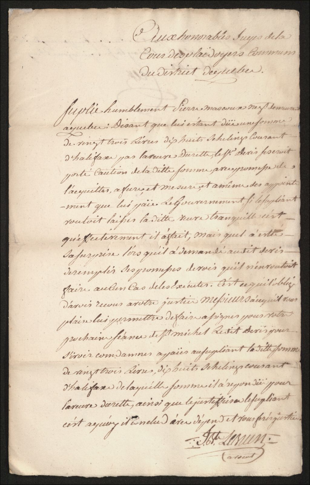 Procès entre Pierre Marcoux, négociant demeurant à Québec, d'une part, et le sieur Devis, demeurant également à Québec, s'étant porté en caution de la veuve Durette, à propos de la somme de 23 livres et 18 shillings en argent d'Halifax que ledit Devis a promis d'acquitter au fur et à mesure avec les appointements que lui paie le gouvernement, 11 octobre 1768 - 15 octobre 1768, Archives nationales à Québec, Fonds Cour des plaidoyers communs, (03Q,TP5,S1,SS1,D597).