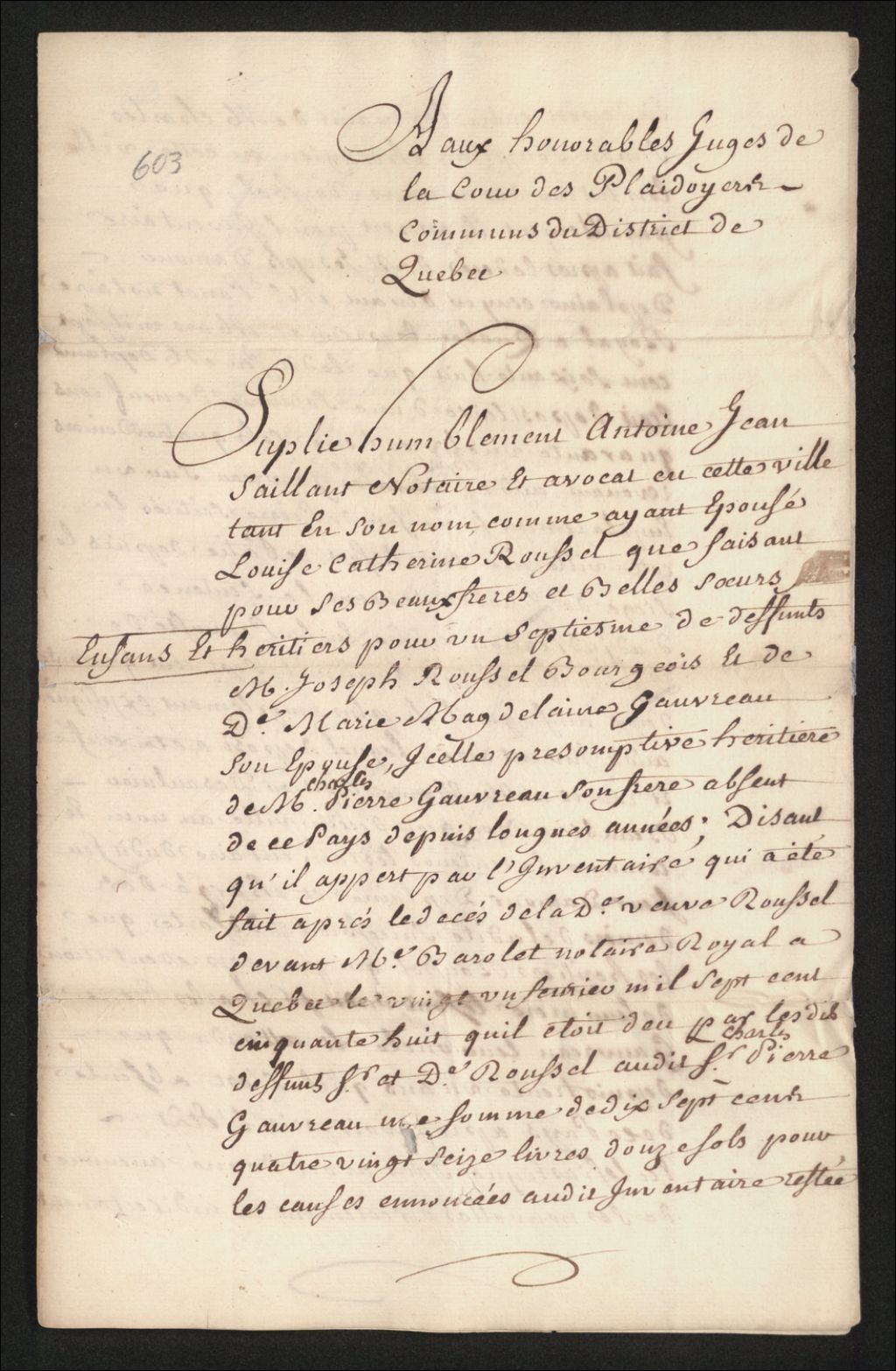 Procès entre Antoine-Jean Saillant, notaire et avocat de Québec, tant en son nom que comme ayant épousé Louise-Catherine Roussel, faisant pour ses beaux-frères et belles-soeurs, enfants et héritiers pour un septième de feus Joseph Roussel, bourgeois, et de Marie-Madeleine Gauvreau, son épouse, héritière présomptive de Charles-Pierre Gauvreau, son frère, absent du pays depuis 31 ans, d'une part, et Charles-Simon Soupiran, chirurgien de Québec, tuteur des mineurs Roussel, et Étienne Trottier Desaulniers Beaubien, bourgeois de Québec, au nom et comme exécuteur testamentaire de feu Joseph D'amour (Damour, Damours) Deplaine (De Plaine, des Plaines), écuyer, et chargé des deniers de la succession dudit défunt, d'autre part, à propos de la négociation de la somme de 1796 livres et 12 sols en argent courant que ledit Soupiran a reconnu avoir reçue en billets d'ordonnance en vertu de l'inventaire fait après le décès dudit Deplaine devant maître Panet, notaire royal de Québec, le 1er mars 1768, et également à propos de la somme de 941 livres, 13 sols et 4 deniers dont ledit Deplaine était dépositaire et revenant audit Charles-Pierre Gauvreau pour un emplacement et une maison en pierre sis rue Sous-le-Fort à Québec, ladite maison rebâtie après le Siège de Québec, mention de l'inventaire fait après le décès de ladite veuve Roussel devant maître Barolet, notaire royal à Québec, le 21 février 1758
