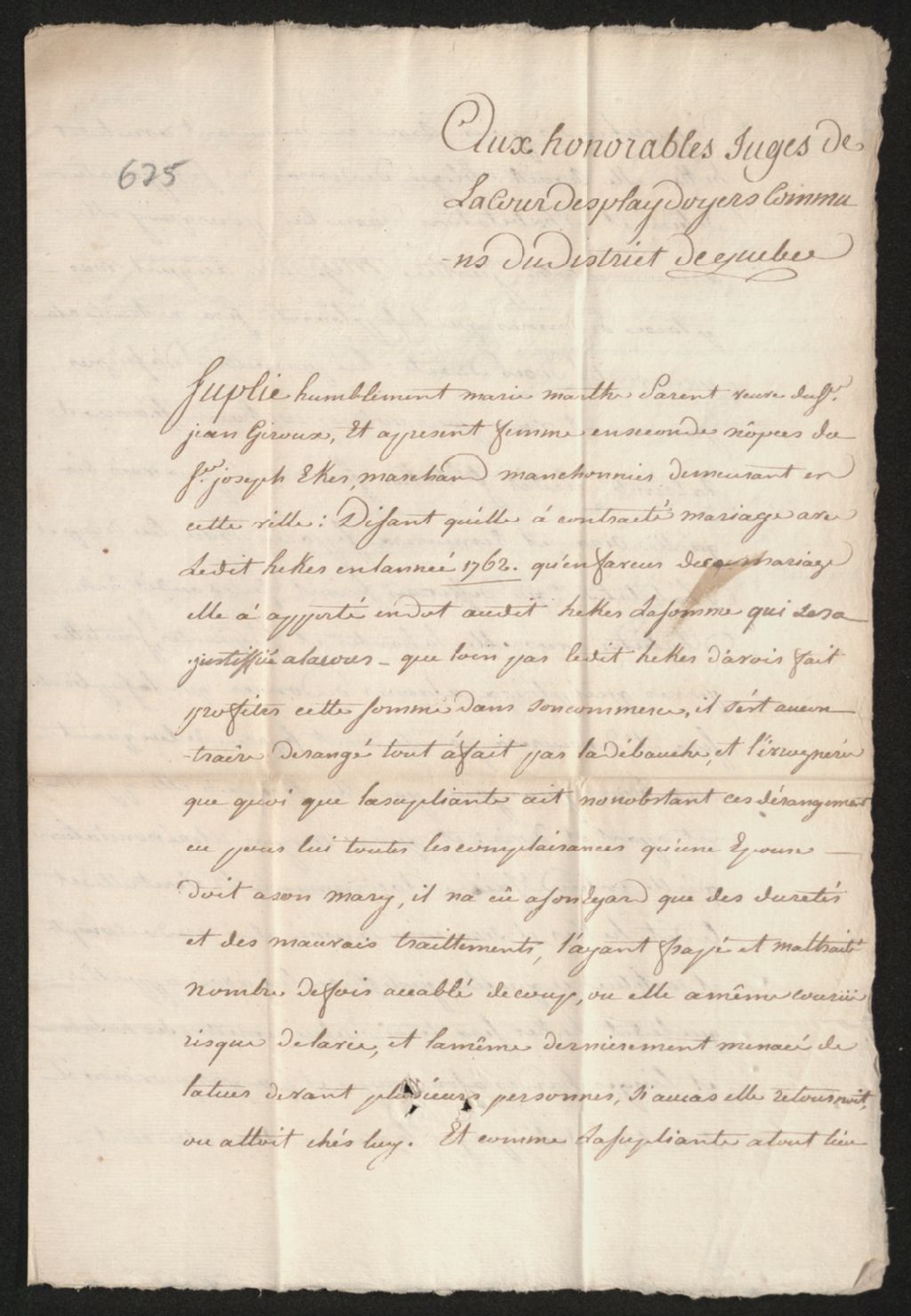 Procès entre Marie-Marthe Parent, veuve de Jean Giroux, épouse en secondes noces de Joseph Eker (Hecker), d'une part, et ledit Joseph Eker, marchand manchonnier (pelletier) demeurant à Québec, d'autre part, à propos de la séparation de biens et d'habitation que la demanderesse réclame à son mari, dérangé par la débauche et l'ivrognerie, à la suite des menaces et des mauvais traitements subis depuis leur mariage en 1762, requérant également que ledit Eker lui restitue ses habits, linges et hardes ainsi que la somme de 6000 livres ou shillings pour son douaire, préciput et droit de communauté, ayant l'intention de renoncer à ladite communauté de biens entre eux, en plus d'exiger la somme de 400 shillings en argent courant par an pour pension, nourriture et entretien