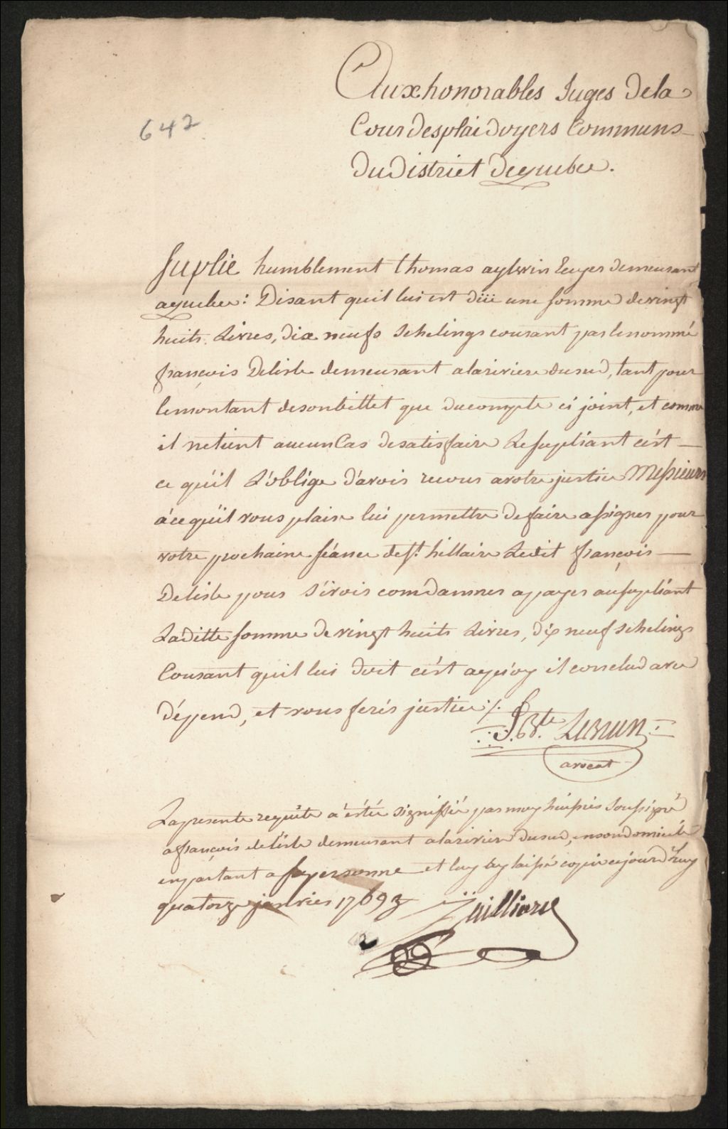- Ce dossier en matières civiles provient de la Cour des plaidoyers communs. Il comprend une requête de Thomas Aylwin, réclamant la somme de 28 livres et 19 shillings en argent courant, un exploit de signification de requête à François Delisle, un mandat d'assignation (warrant) audit Delisle et un exploit d'assignation en conséquence