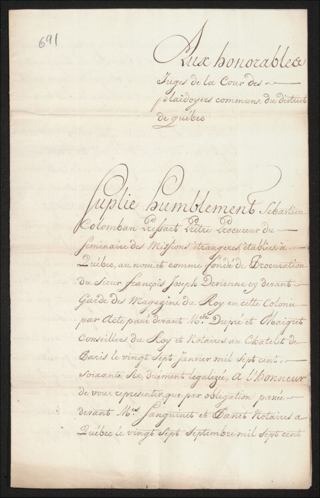 Procès entre Sébastien Colomban-Pressart, prêtre procureur du Séminaire des missions étrangères établie à Québec et procureur de François-Joseph Desienne, d'une part, et François Mounier et Thomas Lee, négociant, d'autre part, à propos d'une somme de 28 848 livres et 15 sols pour le montant de l'hypothèque de tous leurs biens et spécialement d'une maison située à Québec, rue Saint-Pierre, 11 juillet 1769, Archives nationales à Québec, Fonds Cour des plaidoyers communs, (03Q,TP5,S1,SS1,D691).