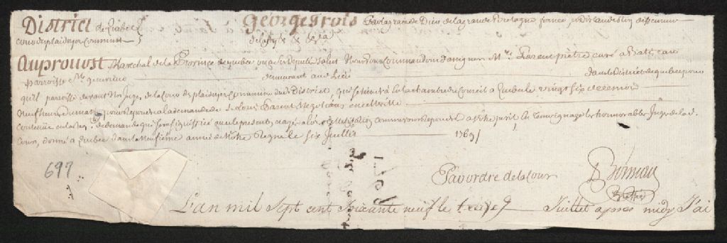 - Ce dossier en matières civiles provient de la Cour des plaidoyers communs. Il comprend une requête de Louis Parent réclamant 220 shillings, un mandat d'assignation (warrant) à Joseph-Basile Parent, un exploit d'assignation en conséquence et une reconnaissance de dette, signée par ledit Joseph-Basile Parent