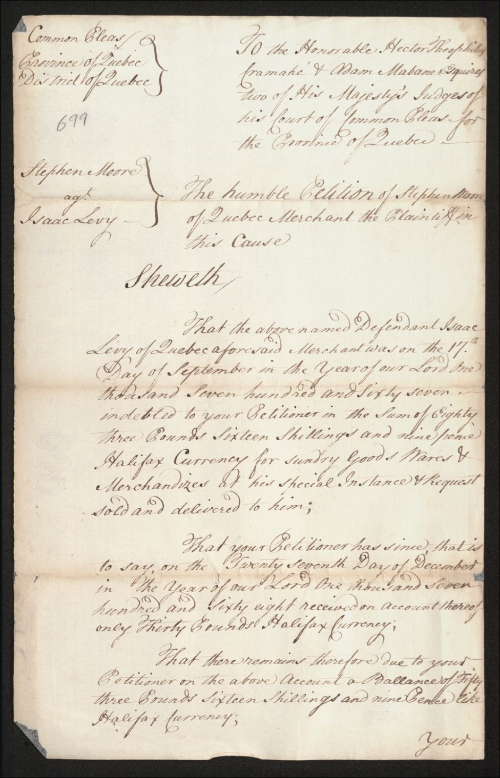 - Procès entre Stephen Moore, marchand, d'une part, et Isaac Levy, marchand demeurant à Québec, d'autre part, à propos d'une somme de 53 livres, 16 shillings et 9 pence, la balance du montant de 83 livres, 16 shillings et 9 pence pour la vente et la livraison de marchandises