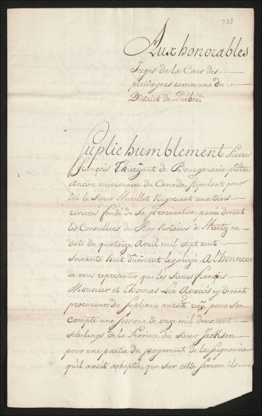 Procès entre Pierre-François Thierzant (Thiersant) de Bourgmarie (Debourgmarie), prêtre et ancien missionnaire du Canada, stipulant par le sieur Maillet, négociant à Trois-Rivières, d'une part, et feu François Mounier et Thomas Lee, négociants et associés, d'autre part, à propos d'une somme de 5488 shillings de la province pour le paiement de la seigneurie acquise par le demandeur, 19 juillet 1769 - 22 juillet 1769, Archives nationales à Québec, Fonds Cour des plaidoyers communs, (03Q,TP5,S1,SS1,D723).