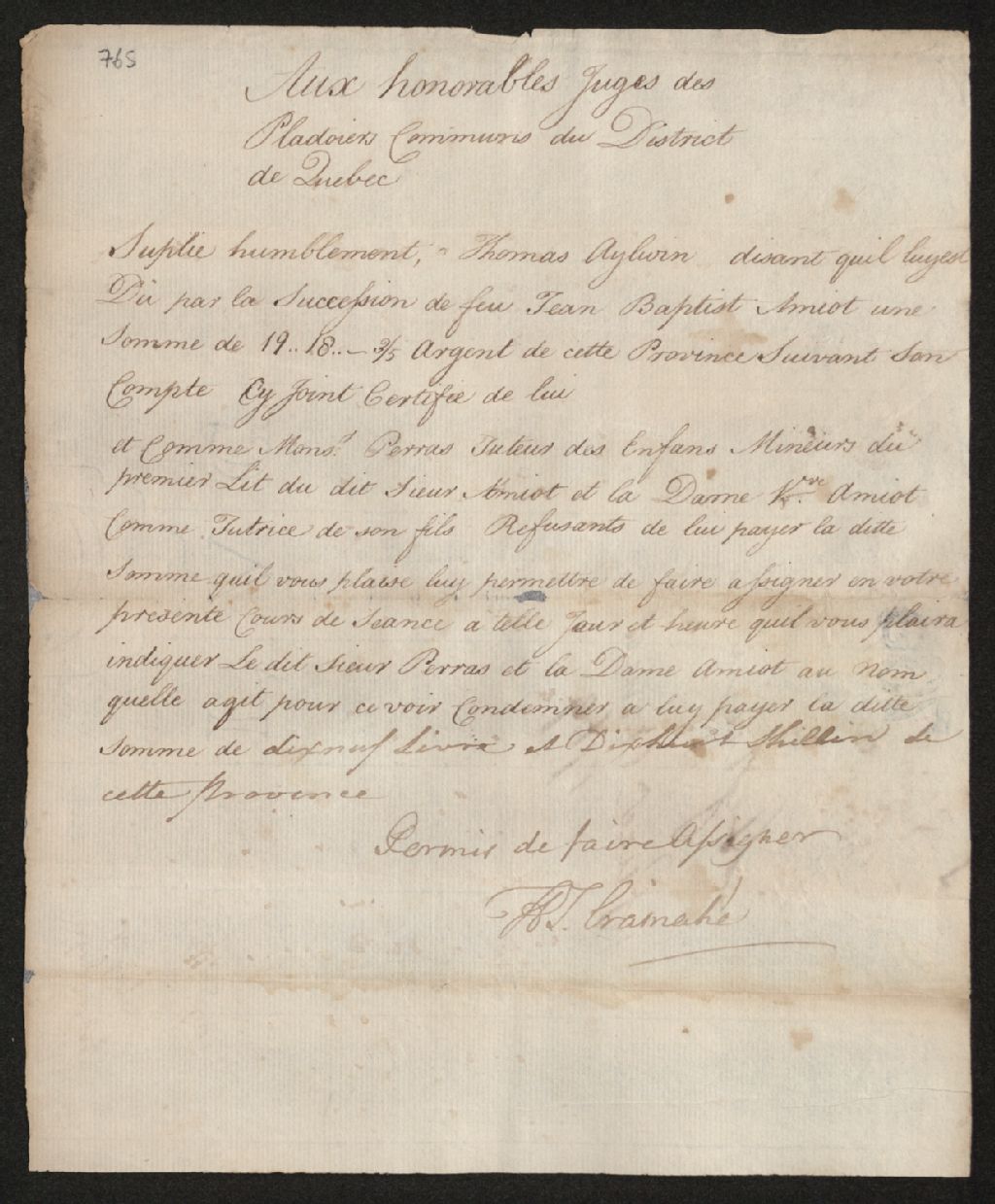 Procès entre Thomas Aylwin, écuyer et juge de paix, d'une part, et le sieur Perras et la veuve du sieur Amiot, demeurant à Québec, au nom de la succession de feu Jean-Baptiste Amiot, d'autre part, à propos d'une somme de 19 livres et 18 shillings courant en vertu d'un compte, 1 janvier 1769 - 23 octobre 1769, Archives nationales à Québec, Fonds Cour des plaidoyers communs, (03Q,TP5,S1,SS1,D765).