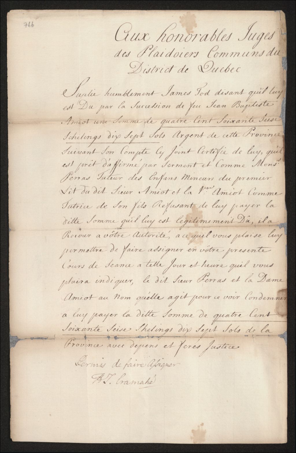 - Procès entre James Tod, d'une part, et le sieur Perras et la veuve Amiot, demeurant à Québec, au nom de la succession de feu Jean-Baptiste Amiot, d'autre part, à propos d'une somme de 476 shillings et 17 sols courant en vertu d'un compte
